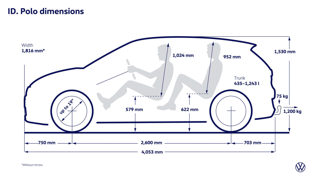尺寸方面,ID. Polo长宽高分别为4053/1816/1530mm,轴距2600mm,和国内加长过的Polo Plus差不多。